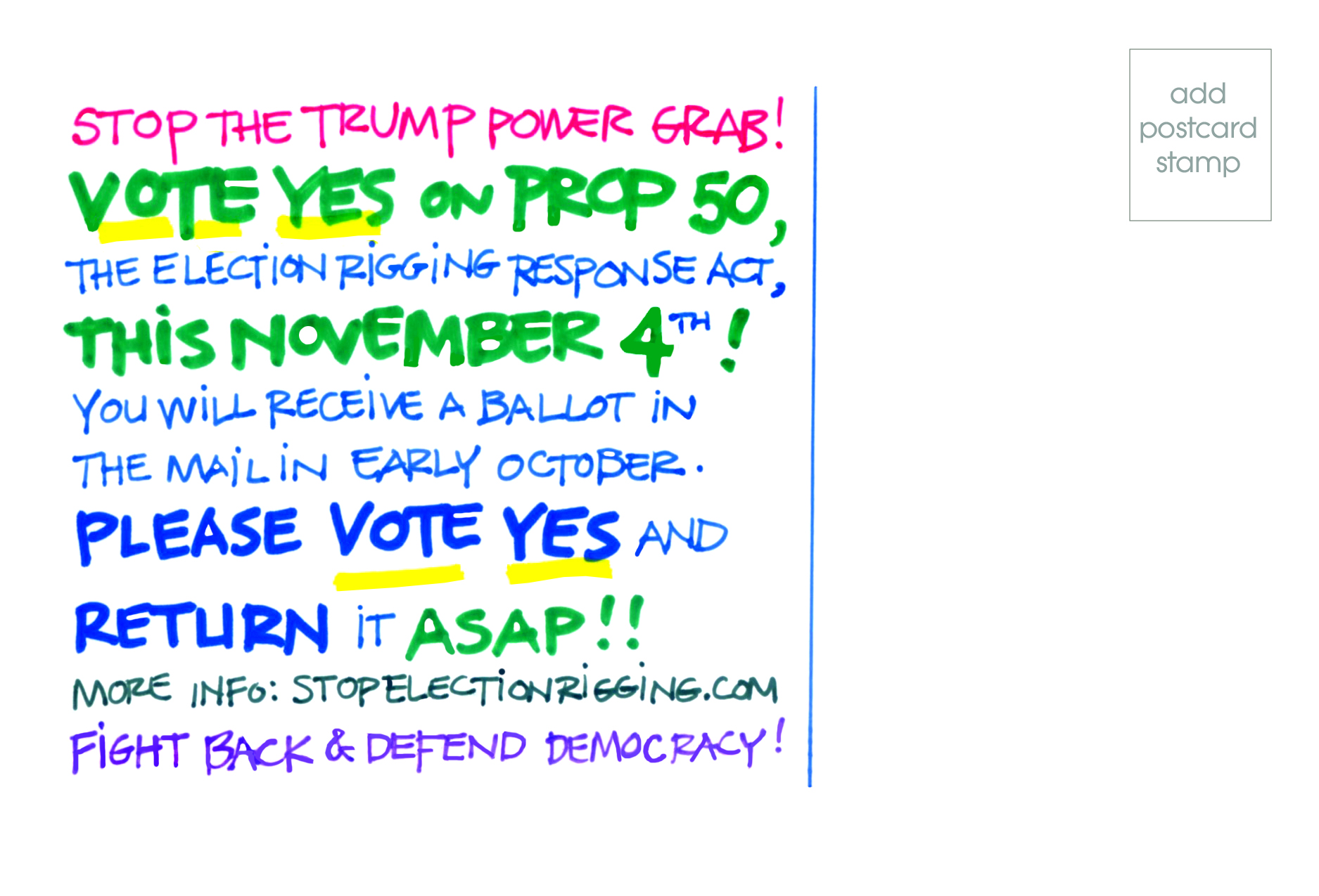 Write YES on CA PROP 50 postcards and help save our Democracy!